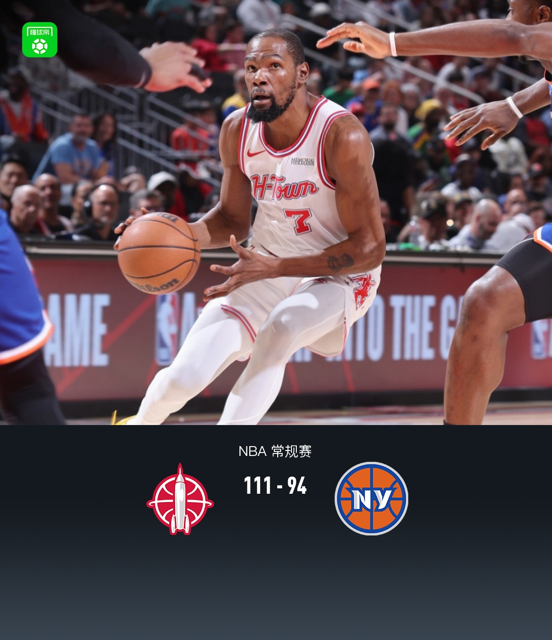 北京时间4月1日NBA 常规赛,休斯顿火箭对阵纽约尼克斯。半场火箭63-50尼克斯,最终火箭111-94尼克斯。