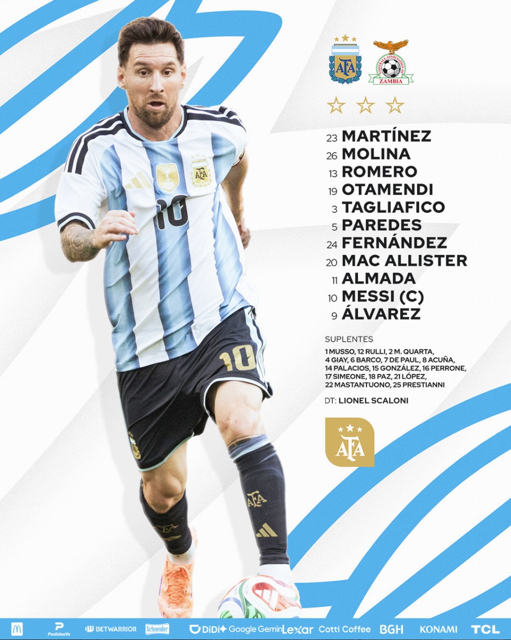 阿根廷vs赞比亚:梅西领衔,阿尔瓦雷斯、麦卡利斯特首发出战