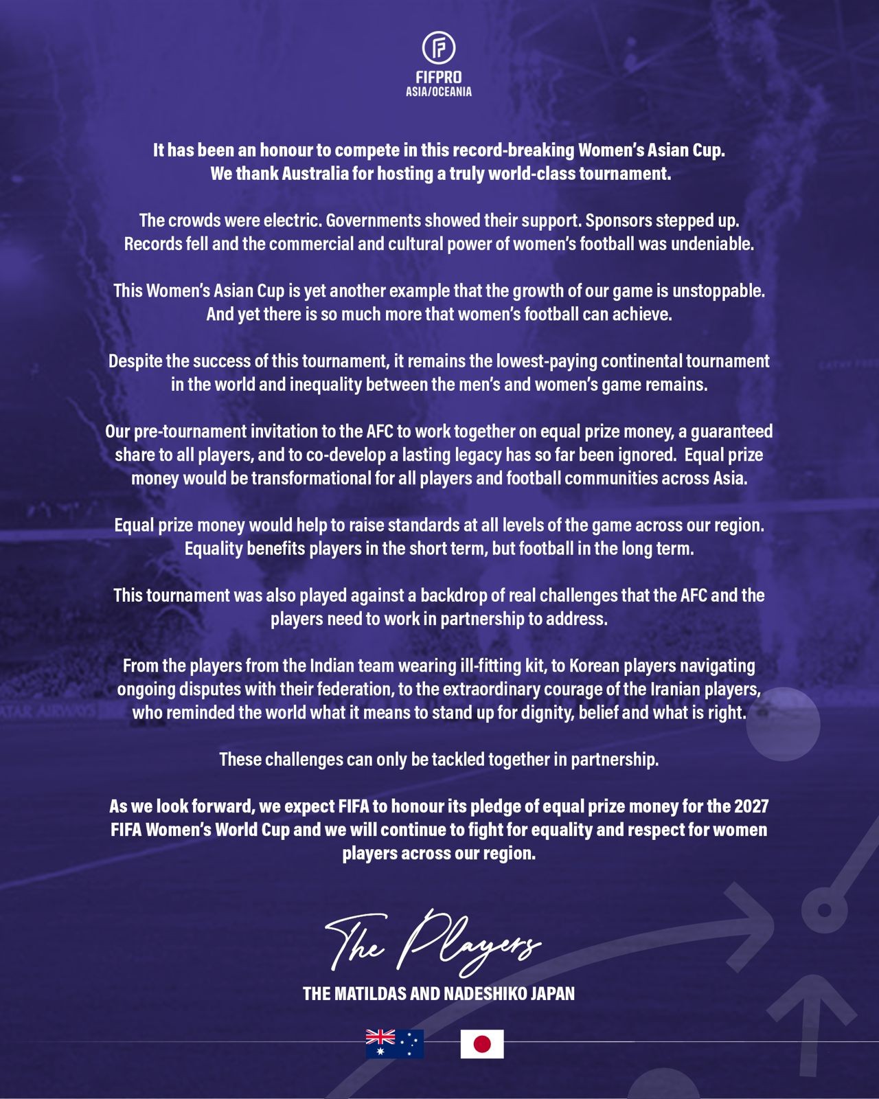 赛前,我们曾向亚足联呼吁:实现奖金平等、向所有球员公平分配奖金、并携手共创可持续的赛事遗产。但截至目前,这一提议尚未被接受。