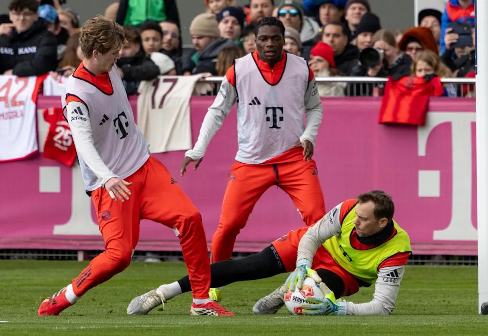 报道称,奥斯马尼已经跟随孔帕尼训练了数周,其余4人则是在本周一首次进入一线队训练。几名小将的表现都相当积极。冯-陶贝在前场取得进球,施密德也在诺伊尔所在一方的对抗赛中破门,马斯平比在防守端表现稳健,努拉伊和奥斯马尼则在场上为每一个球全力拼抢。