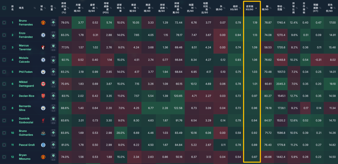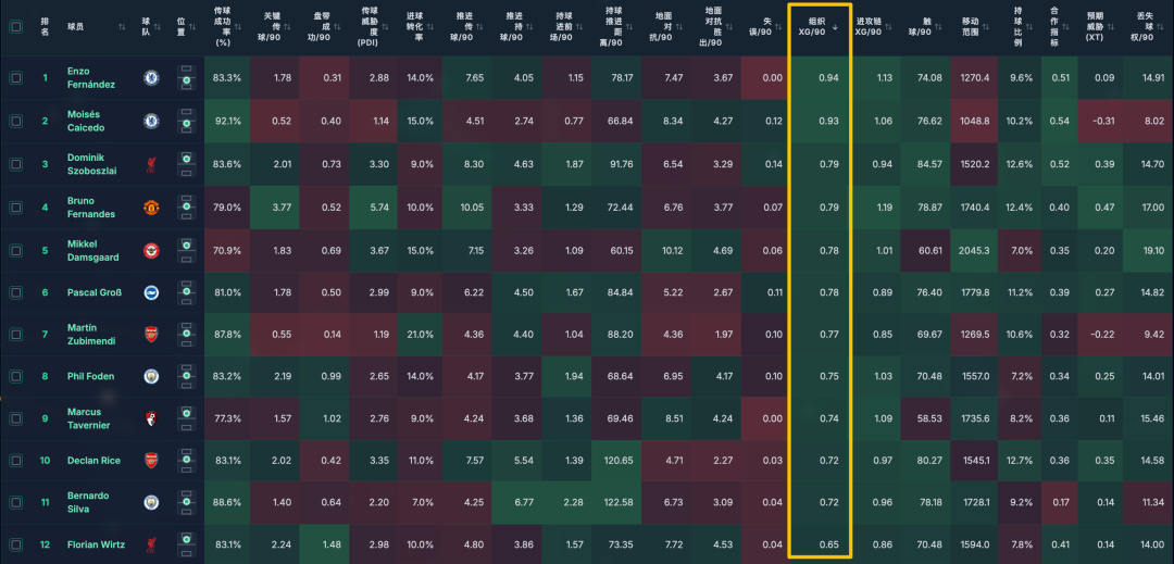 xG Chain最高的前五名球员,分别是B费、恩佐、塔维尼耶、凯塞多以及福登。(两名切尔西球员上榜,可见切尔西中场有多强势)
