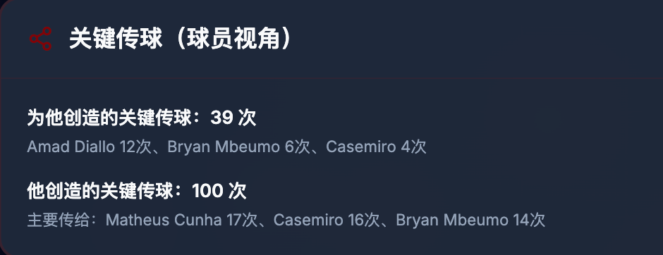 因此,B费在曼联进攻当中承载的就是二点球和倒数第二传的串联任务,活动范围大,这让曼联几乎所有的进攻都会从他脚下过一遍,配上狗叼飞盘以及曼联新的前场田径运动员的进攻组合,然后他再从肋部反插进去,这种简洁的打法在高速的反击推进当中就容易刷起来。