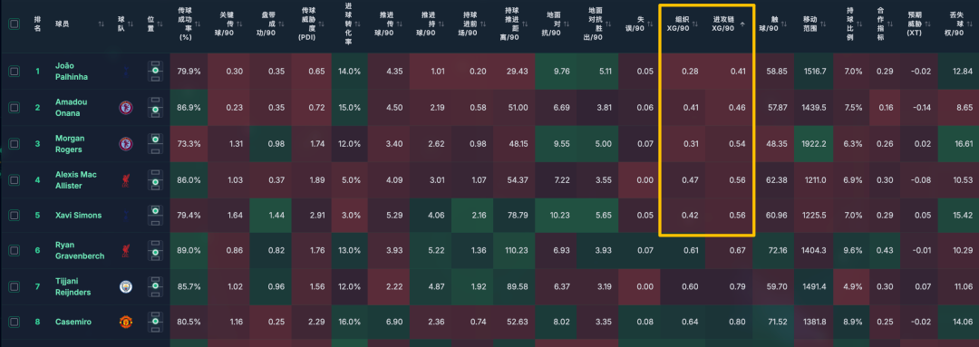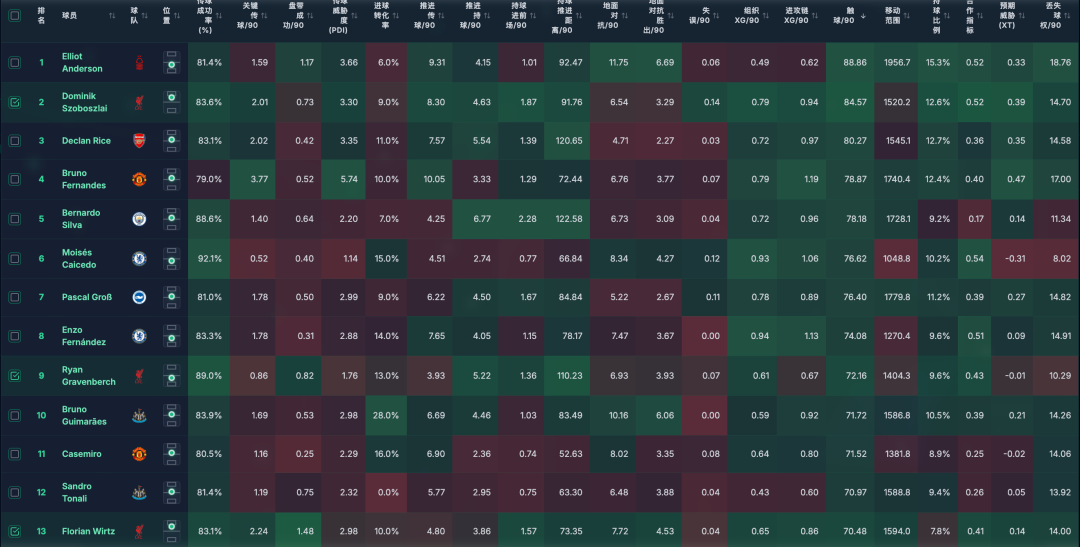 因为去掉了最后两个动作(射门&关键传球),使得这个榜单上大部分上榜的都是中场位置偏靠后的球员,恩佐、凯塞多、索博斯洛伊、苏维门迪、赖斯等。