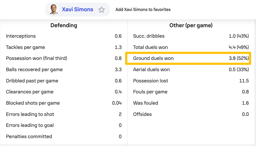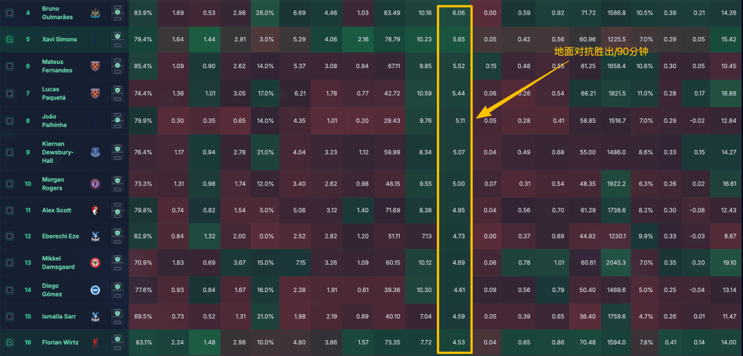 在筛选出1440分钟出场的52名球员里,无论是维尔茨还是西蒙斯,都有意地开始习惯英超的对抗和节奏,表现确实可以,但是一些“老英超”,这方面的发挥就不太行了: