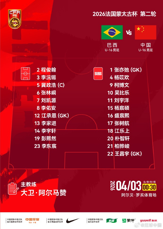 北京时间4月3日0:30,蒙太古杯小组赛第2轮,U16国少对阵巴西U16。赛前首发公布。