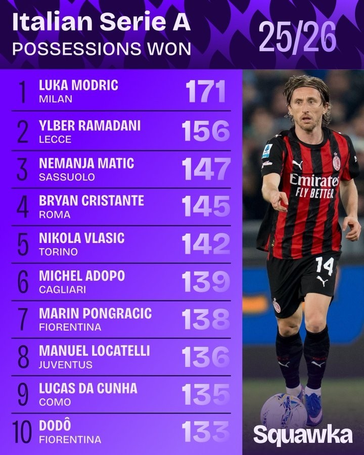 北京时间4月3日,知名数据平台Squawka更新本赛季意甲夺回球权次数排行榜,40岁老将莫德里奇171次位列第一。