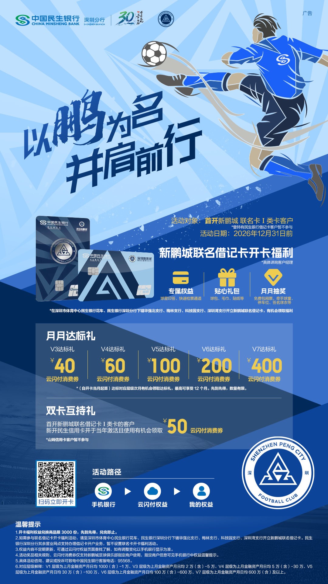 中国民生银行×深圳新鹏城足球俱乐部联名借记卡正式上线,联手为球迷一起带来专属福利!