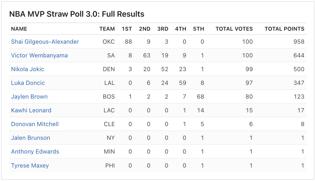 而且,尽管文班亚马在赛季末发起强势冲刺,丹佛掘金队中锋约基奇继续打出超凡表现,洛杉矶湖人队后卫东契奇也刚打出了单月600分的表现(自1987年乔丹以来首位在三月份做到这一点的球员),亚历山大仍然稳居榜首。亚历山大在100张选票中获得了88张第一名选票,同时还有9张第二和3张第三名选票,总计958分,领先文班亚马超过300分。