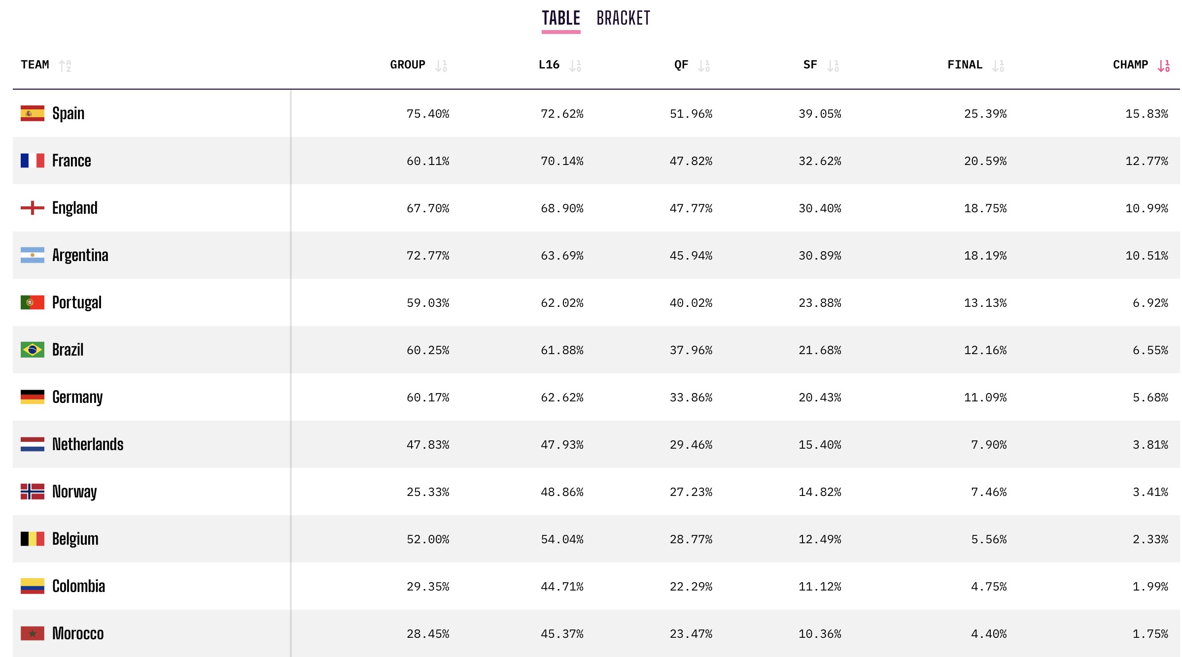 北京时间4月1日,2026年世界杯48支参赛球队全部确定。知名数据平台Opta通过超级计算机对接下来世界杯进行了预测。预测结果显示,西班牙以15.83%的夺冠概率位列第一。