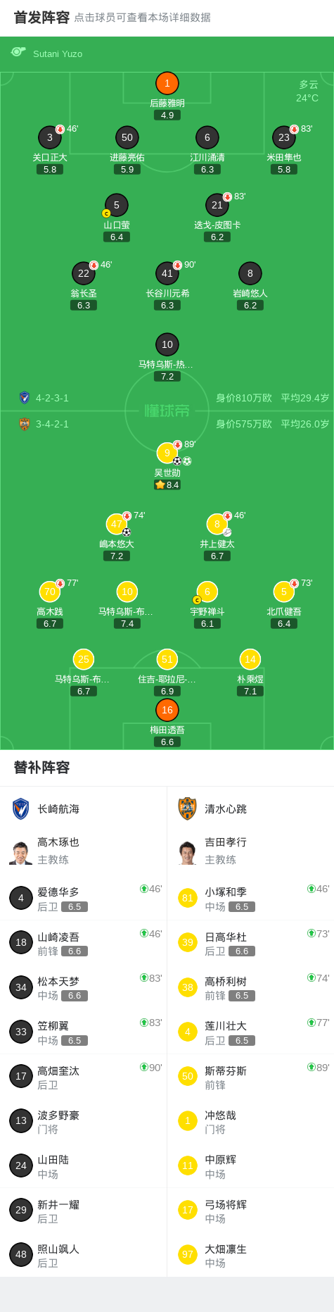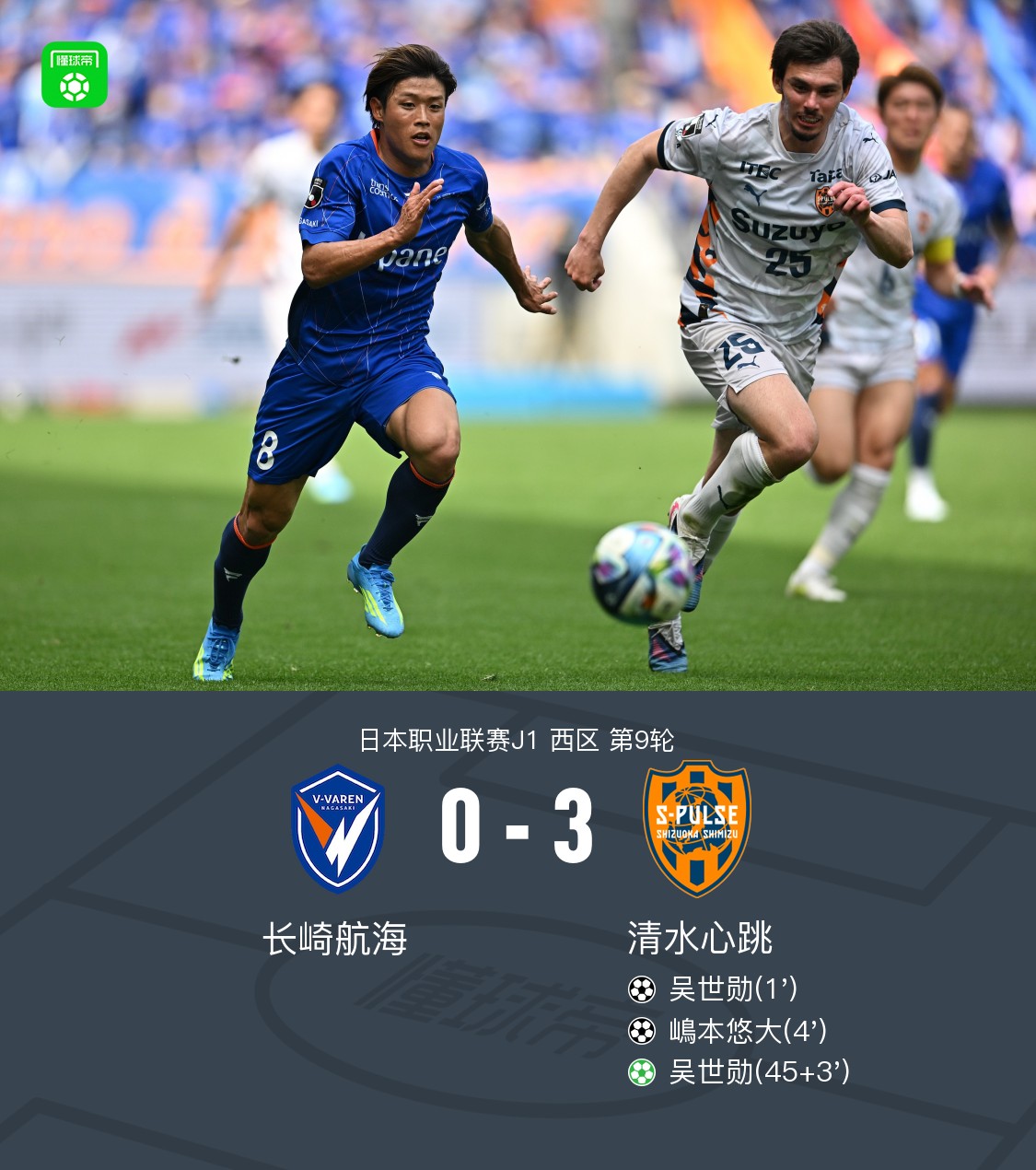 北京时间4月5日日本职业联赛J1 西区 第9轮,长崎航海主场对阵清水心跳。清水心跳吴世勋梅开二度,嶋本悠大破门。最终比分长崎航海 0–3 清水心跳。