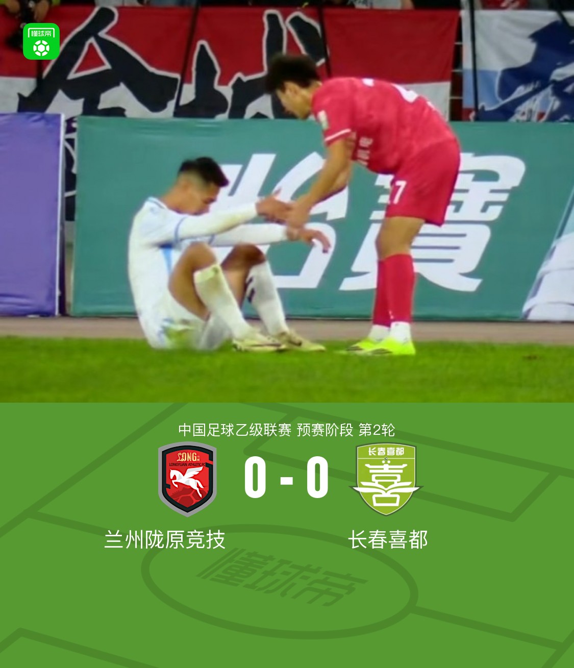 北京时间4月5日中国足球乙级联赛 预赛阶段 第2轮,兰州陇原竞技主场对阵长春喜都。最终比分兰州陇原竞技 0–0 长春喜都。