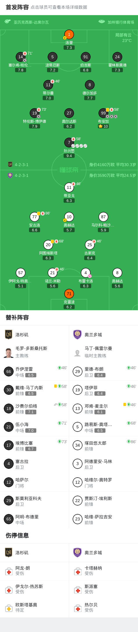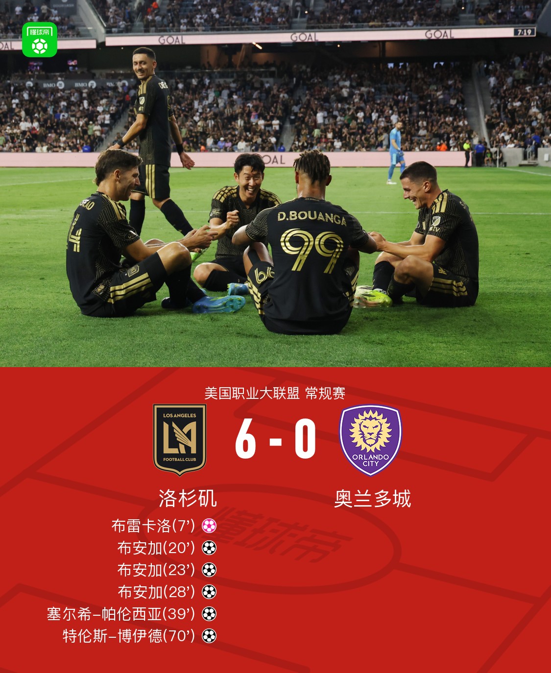 第28分钟,孙兴慜助攻布安加8分钟内戴帽!洛杉矶28分钟4-0领先奥兰多城