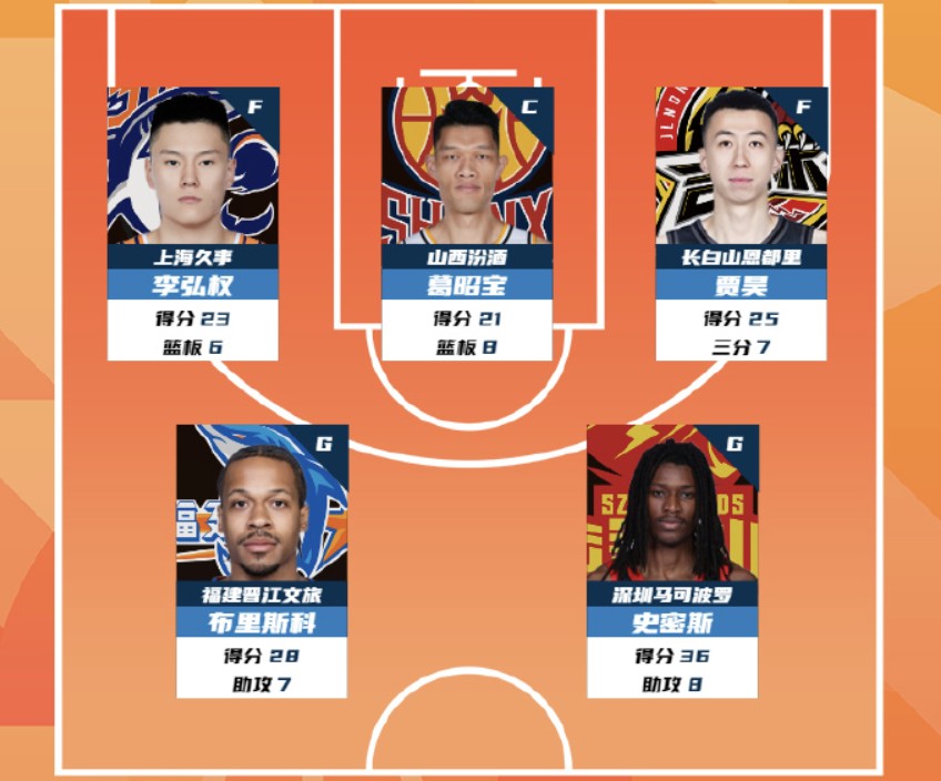 北京时间4月5日,CBA官方公布了常规赛第34轮的最佳阵容,上海球员李弘权、山西中锋葛昭宝、吉林球员贾昊、福建外援布里斯科和深圳外援史密斯入选。