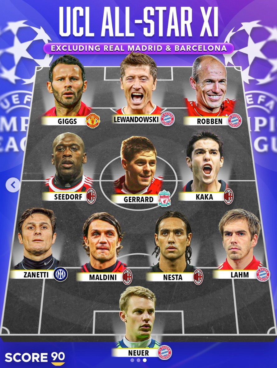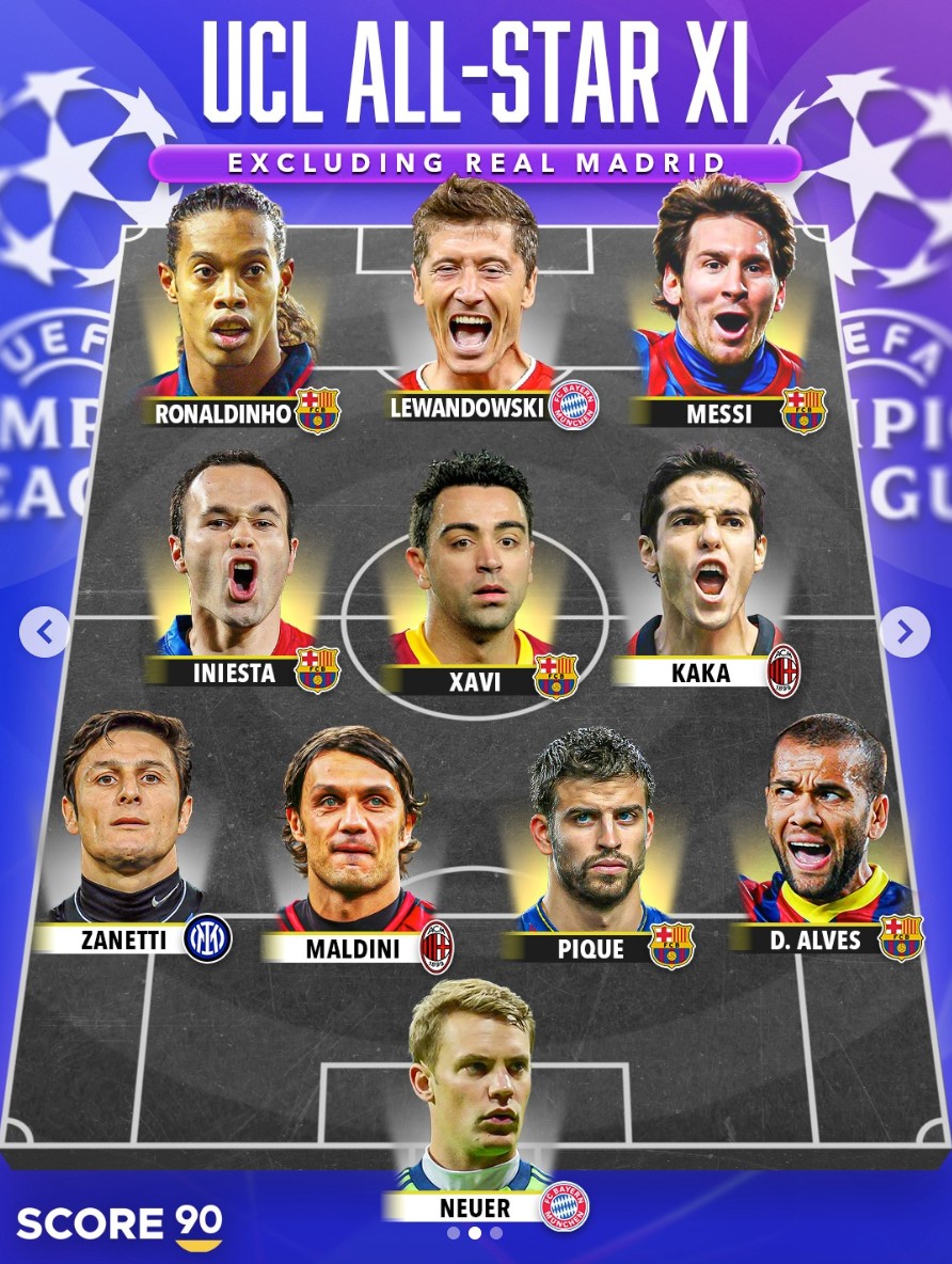 北京时间4月6日,Score90列出了自1992-93赛季改制以来欧冠的全明星阵容,C罗和梅西领衔,皇家马德里占据8席。
