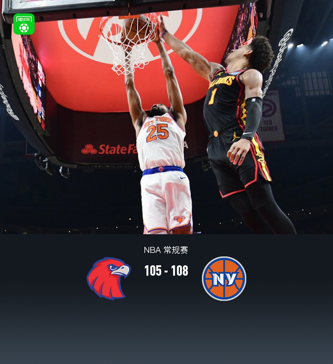 北京时间4月7日NBA 常规赛,亚特兰大老鹰对阵纽约尼克斯。半场老鹰57-53尼克斯,最终老鹰105-108尼克斯。