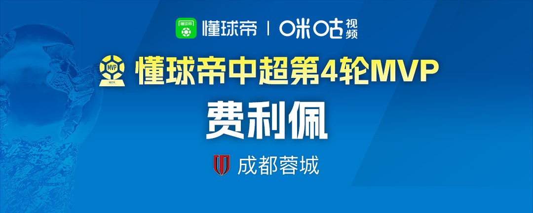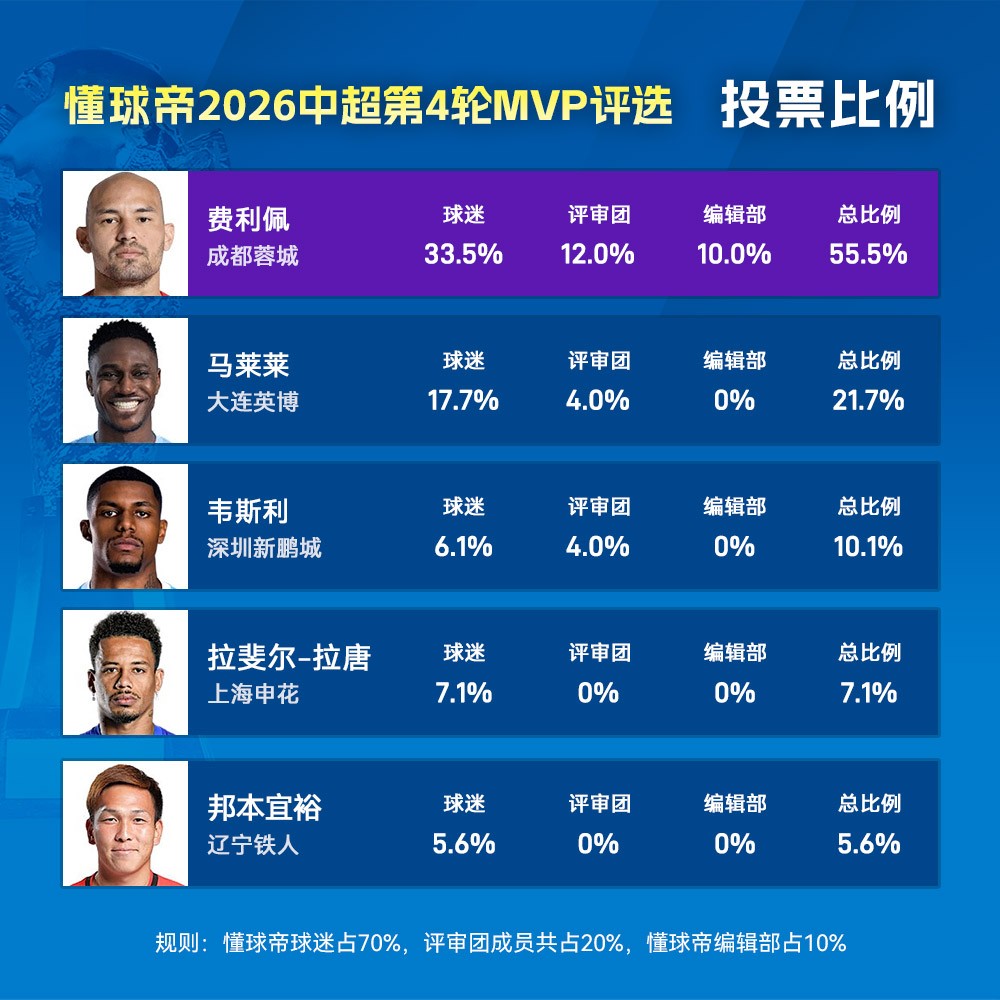 大家好,欢迎来到懂球帝2026赛季中超MVP的评选现场。中超第4轮MVP的评选结果已经出炉,成都蓉城外援费利佩凭借34岁生日夜替补登场完成帽子戏法的惊艳表现,以55.5%的得票率大幅领先,成功当选!