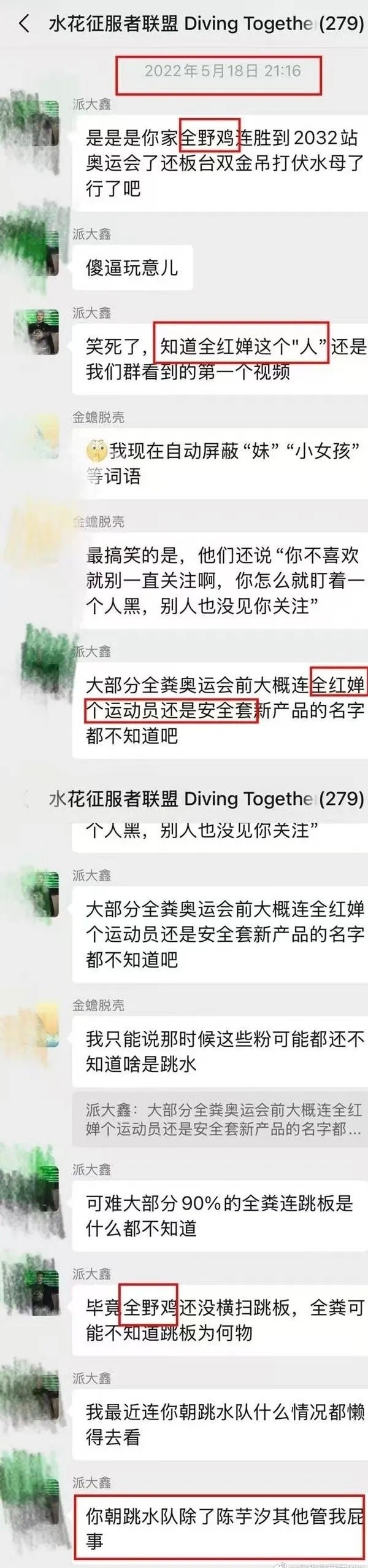近日,据博主HeyWarWars消息,一个名为“水花征服者联盟 Diving Together”的微信群聊记录被曝光,其中包含大量对奥运冠军全红婵的辱骂和人身攻击,内容可谓不堪入目。