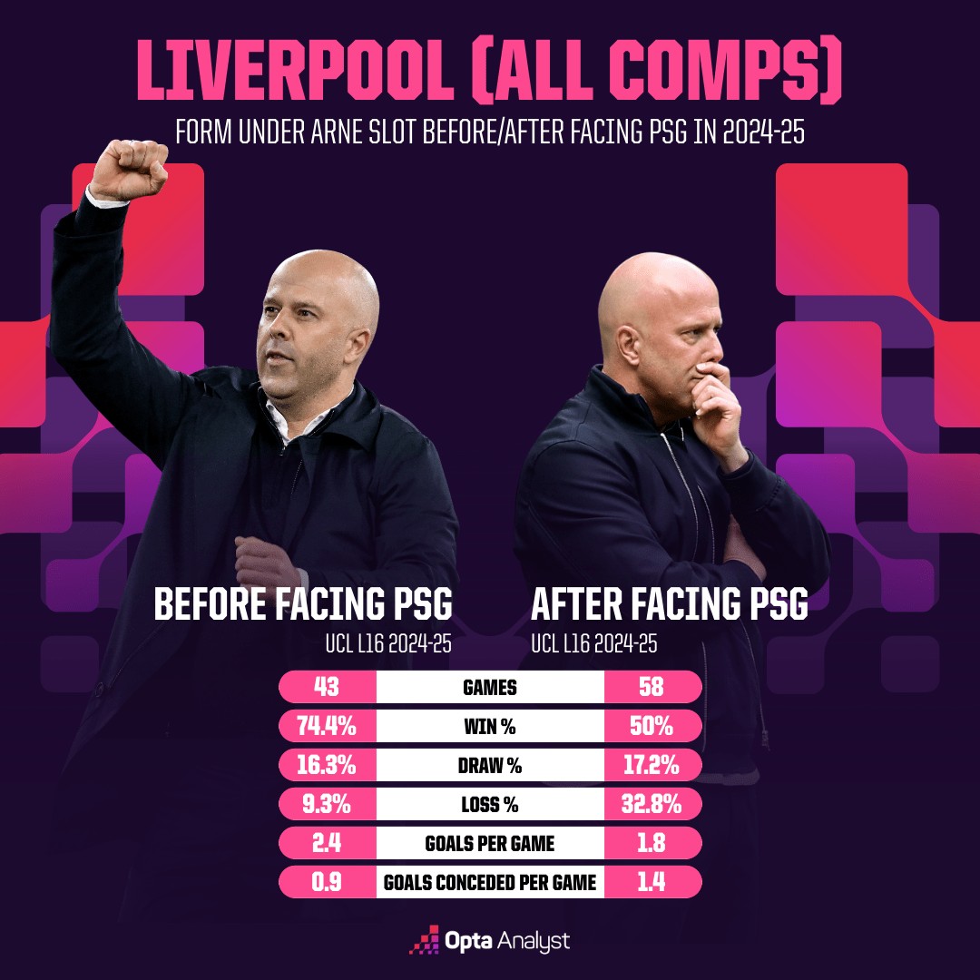 据统计,在上赛季欧冠16强战对阵巴黎之前,斯洛特在执教利物浦的前43场比赛中赢下32场(胜率74.4%),战平7场(16.3%),只输过4场(9.3%)。