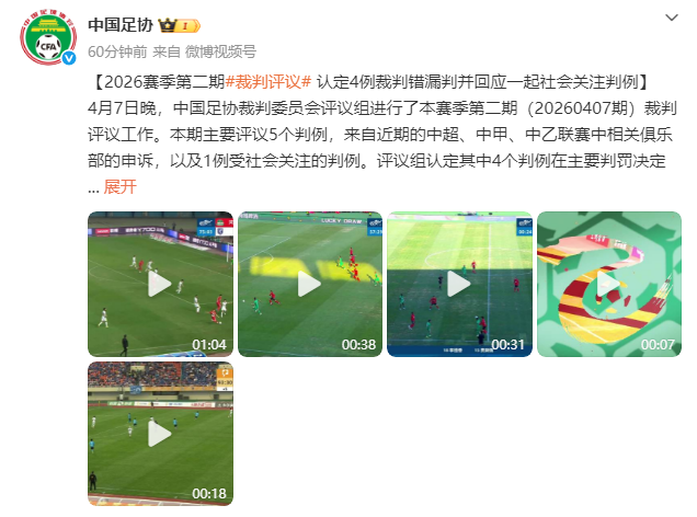 4月8日下午,中国足协公布了2026赛季第二期裁判评议结果,认定4例裁判错漏判,并回应一起社会关注判例。其中,与中超赛场有关的3个判例中,2个出现错漏判。