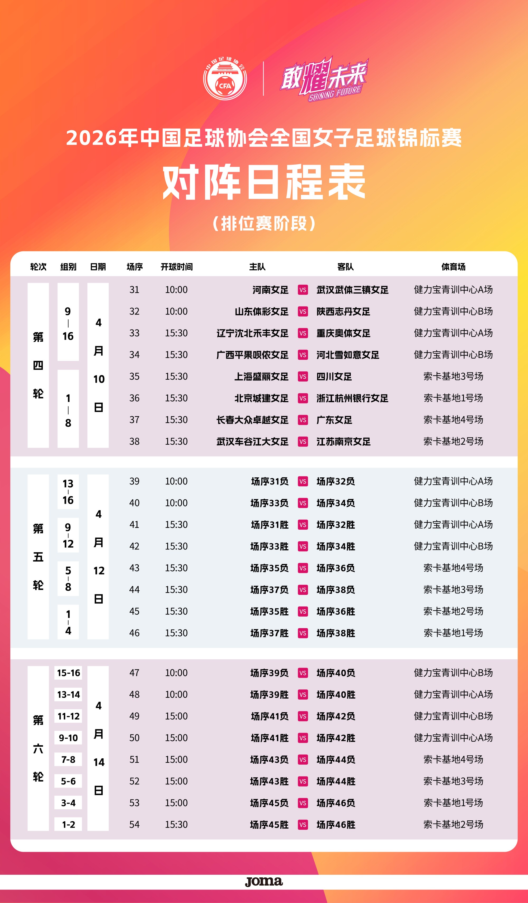 女足官方写道:“根据2026年全国女足竞赛计划安排,2026年全国女子足球锦标赛排位赛阶段将于4月10日至14日在广东省珠海市和佛山市进行。具体赛程如下:”