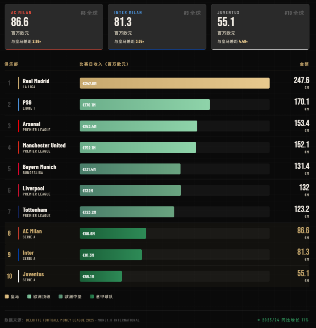 德勤2023/24赛季的代表性球队比赛日收入数据