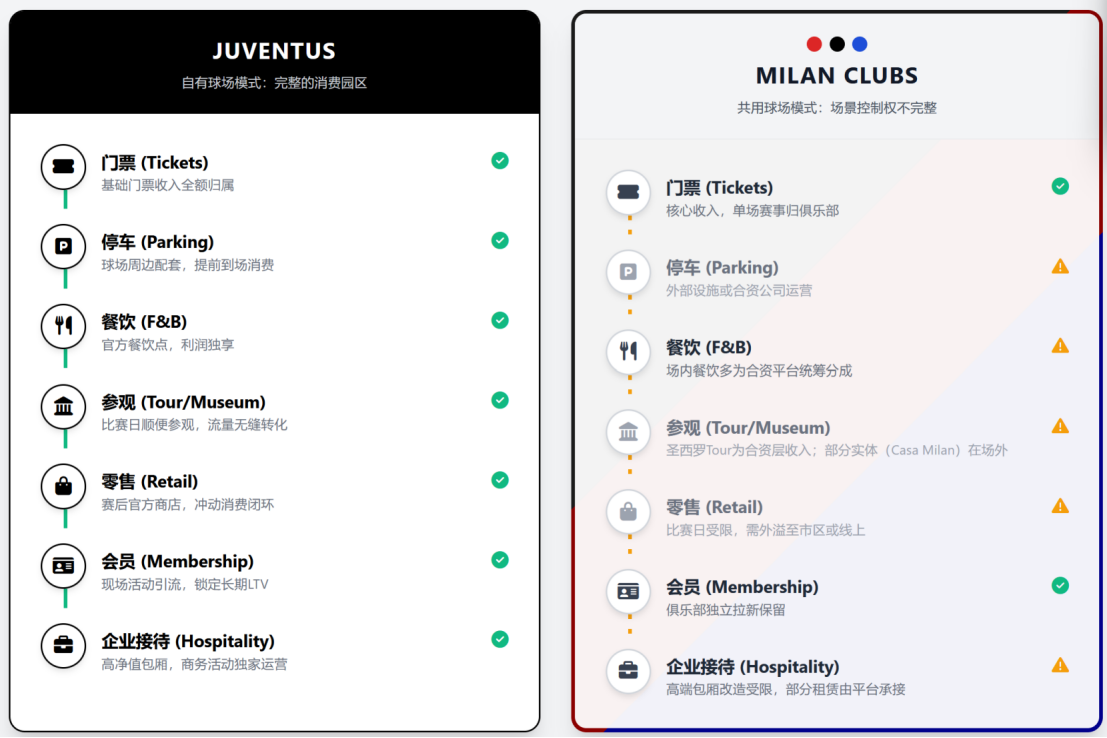 如果将球场对俱乐部收入的作用仅仅理解为“座位越多、门票卖得越多”,显然低估了现代足球场馆的商业价值。对于头部俱乐部而言,球场早已不是单一的比赛承载空间,而是一个能够持续创造多层次收入的综合经营平台。除门票、季票、现场餐饮、停车及会员服务等基础比赛日收入外,球场还可以通过 VIP 包厢、企业合作、场馆广告、联名消费、博物馆及球场参观等产品,贡献更高附加值的收入。作为全球足球商业化程度最高的联赛之一,英超在这一方面已形成较为成熟的经营体系;相比之下,曾长期处于欧洲足坛核心位置的意甲,在场馆商业开发层面已明显落后,这也成为意甲球迷长期批评的焦点之一,在那些至今仍未完全拥有和控制自有球场资产的俱乐部身上尤甚。由此,一个关键问题便浮现出来:对于职业足球俱乐部而言,缺乏自有球场,究竟会在多大程度上限制其收入能力?