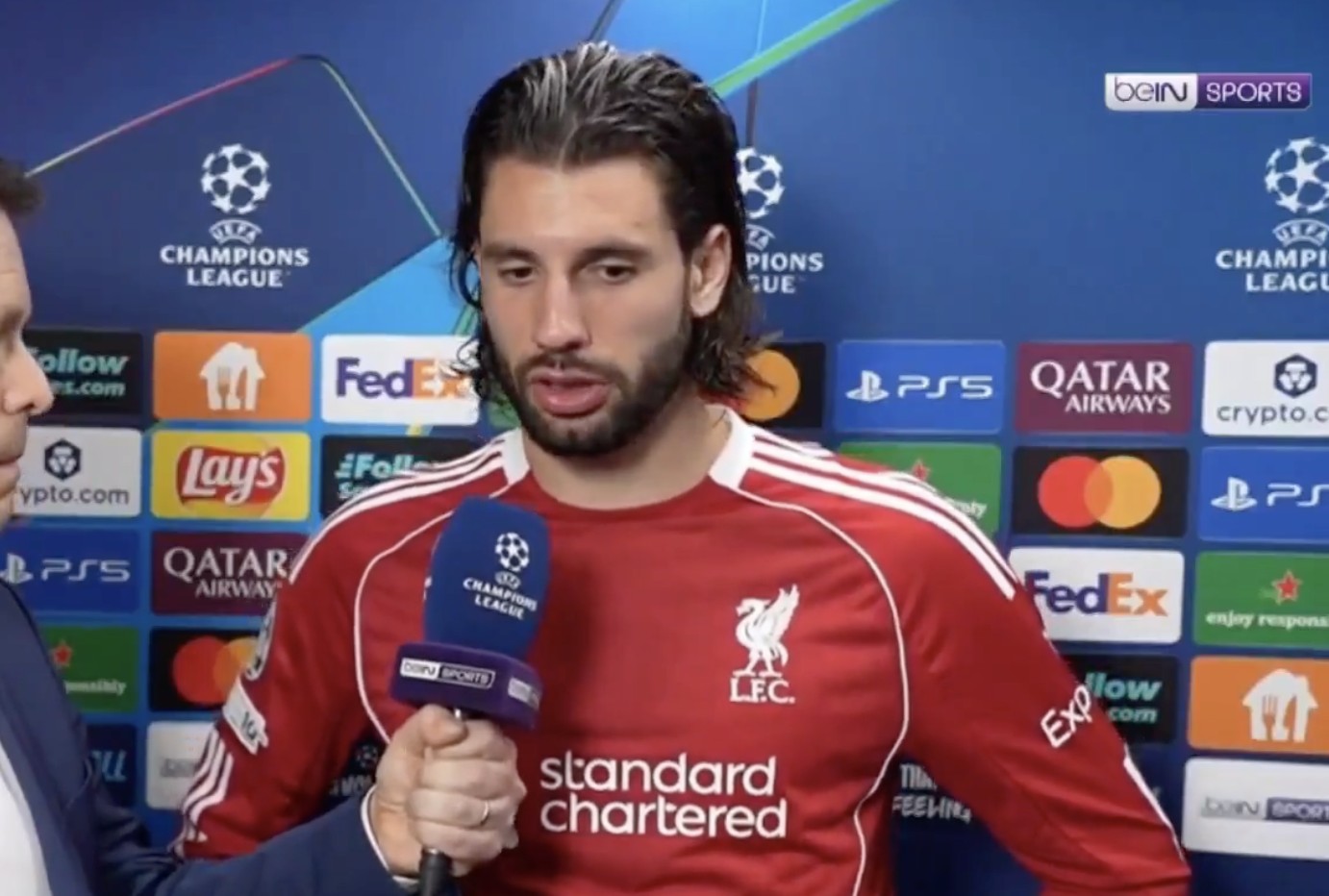 这显然是利物浦的一个艰难夜晚。确实非常艰难。我们面对了一支非常强的球队,但比赛还有90分钟。我们仍然相信有机会。我觉得我可以代表每个人发声——整个球场、球迷,但最重要的是代表球队和主教练。我们必须继续努力,在剩下的90分钟里全力以赴。
