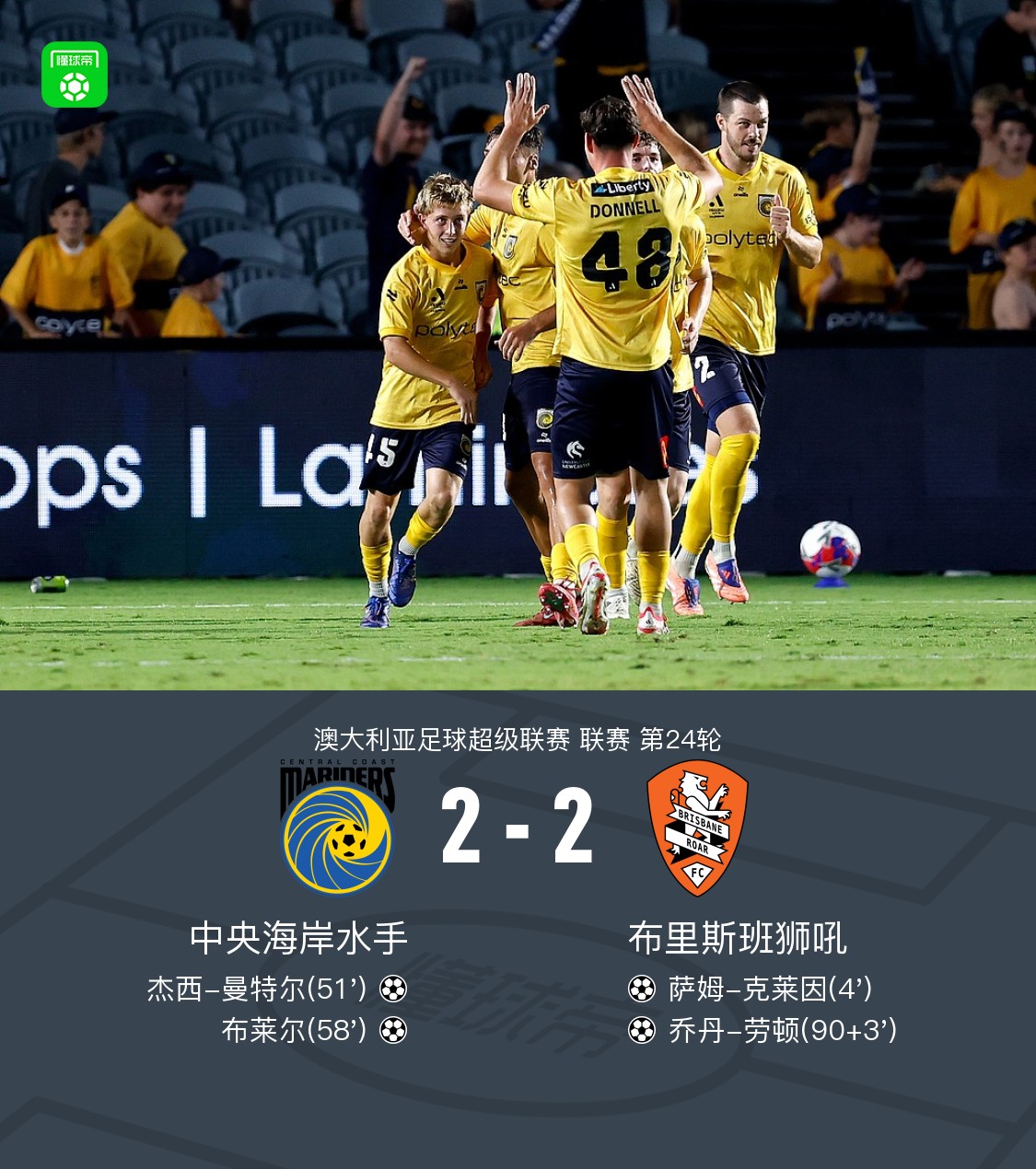 北京时间4月10日澳大利亚足球超级联赛 联赛 第24轮,中央海岸水手主场对阵布里斯班狮吼。中央海岸水手杰西-曼特尔破门,布莱尔破门。布里斯班狮吼萨姆-克莱因破门,乔丹-劳顿破门。最终比分中央海岸水手 2–2 布里斯班狮吼。