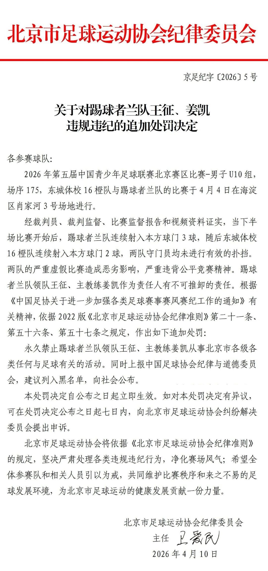 4月10日,北京市足协发布追加处罚决定,对踢球者兰队领队王征、主教练姜凯,东城体校16橙队领队于洋、主教练崔宇,进行永久禁止从事北京市各级各类任何与足球有关活动的处罚。