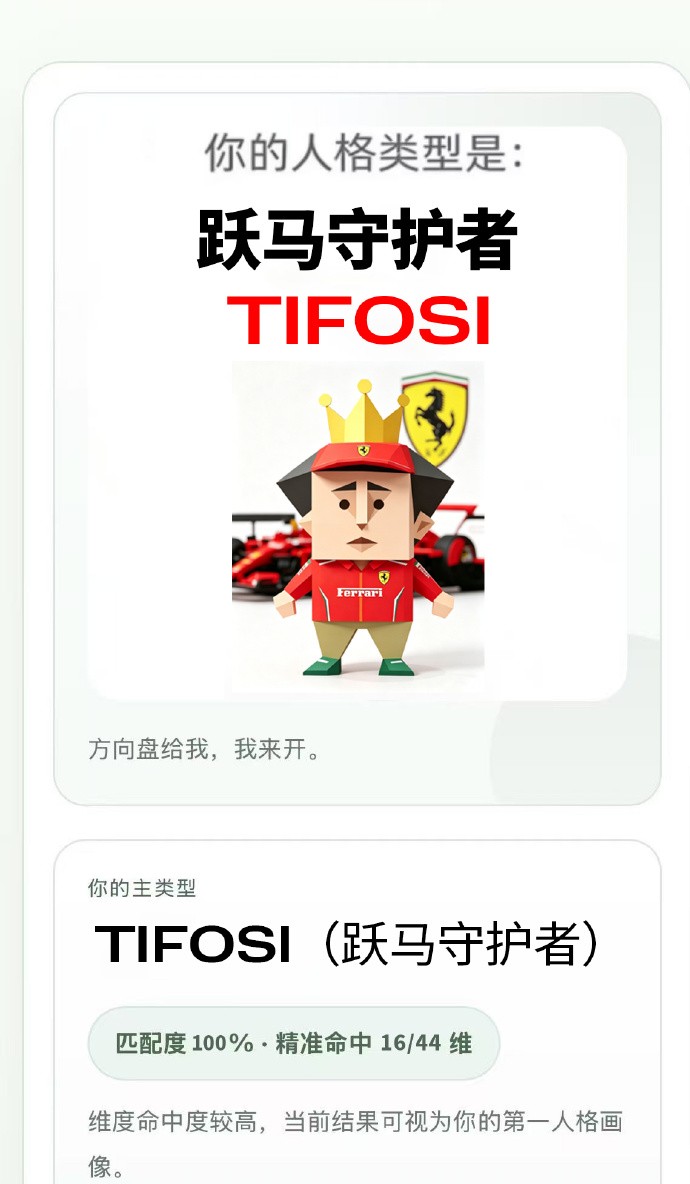 这是法拉利F1车队在官博发布的SBTI:TIFOSI。“方向盘给我”,致敬了SBTI中“BOSS”类型的特点。