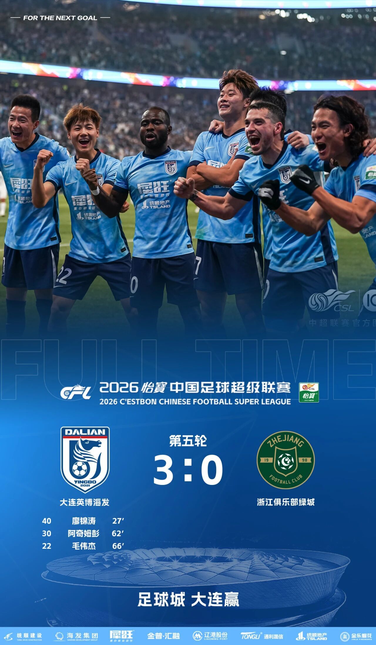 最终,凭借着廖锦涛、阿奇姆彭、毛伟杰的进球,大连英博海发队3-0战胜浙江俱乐部绿城队!取得联赛三连胜!