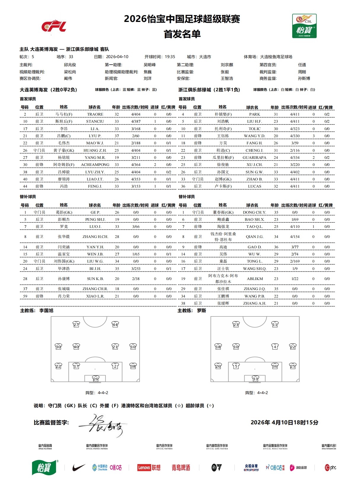 北京时间4月10日19:00,中超联赛第5轮,大连英博坐镇主场迎战浙江队,本场比赛主裁判是邱兆俊,VAR是梁松尚,赛前双方公布首发: 文章导航 为J.Cole腾名额,南京同曦官方:球队与小外援杰伦-汉斯解约 官方:李玮锋出任中甲宁波队主教练,此前球队主帅杨林辞职