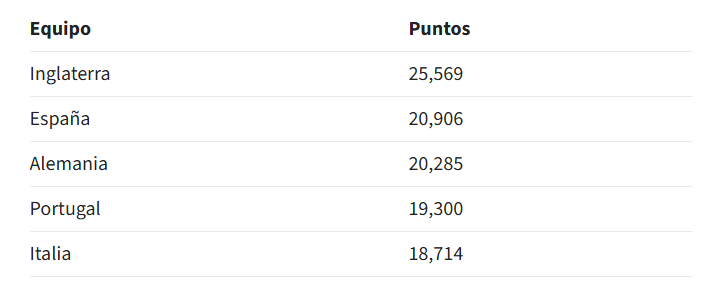 英格兰目前积25.569分,西班牙20.906分,德国20.285分,虽然紧追但还落后西班牙。