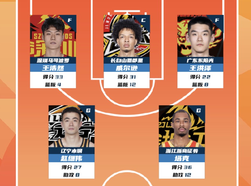 北京时间4月10日,CBA官方公布了常规赛第35轮的最佳阵容,深圳队球员王浩然、吉林队外援威尔逊、广东队球员王洪泽、辽宁队后卫赵继伟以及广厦队外援塔克入选。