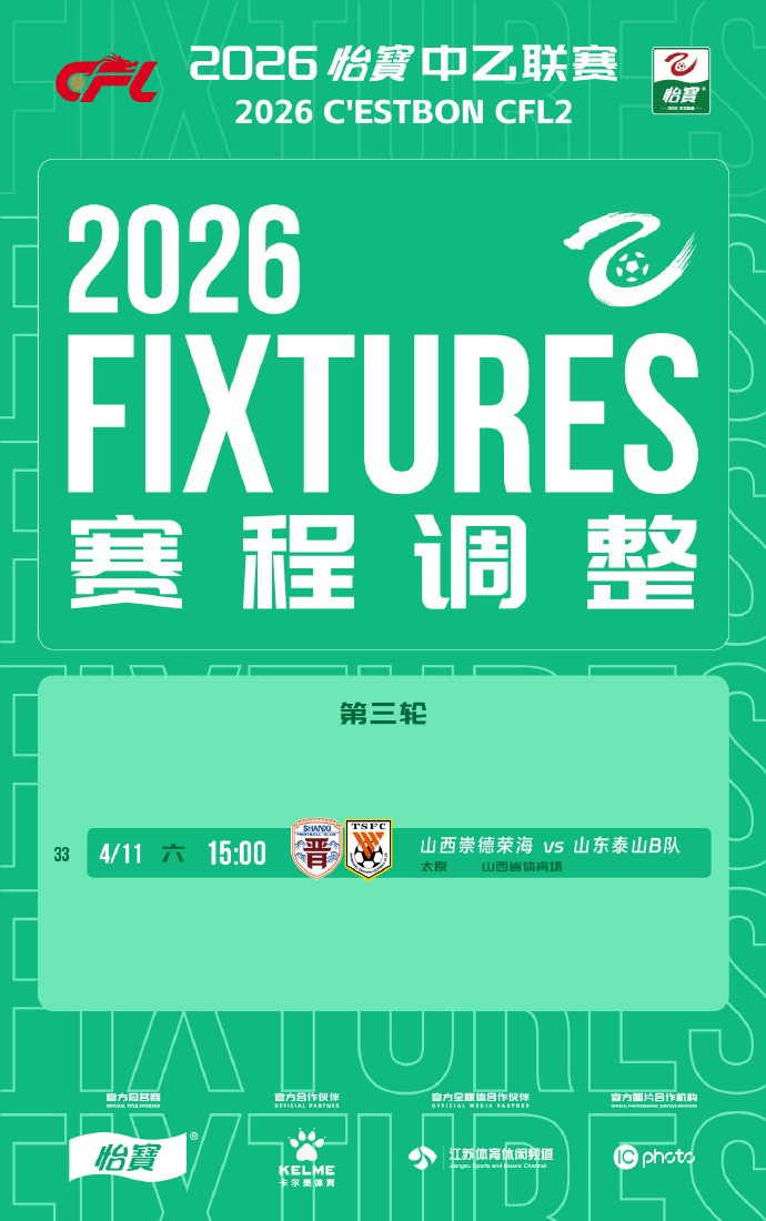为更好的做好赛事服务和保障,经山西崇德荣海足球俱乐部、山西省足球协会共同申请,山西省体育局来函同意,并协商客队同意,现决定调整2026怡宝中乙联赛第3轮第33场山西崇德荣海对阵山东泰山B队的比赛场地,比赛日期和开球时间不变。
