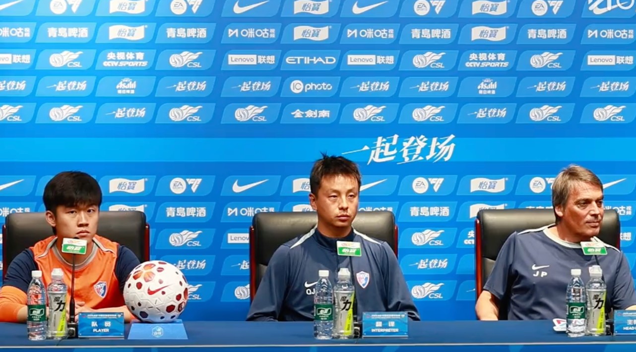 4月11日,中超联赛第5轮赛前新闻发布会,云南玉昆助教哈维尔和球员杨梓豪出席。