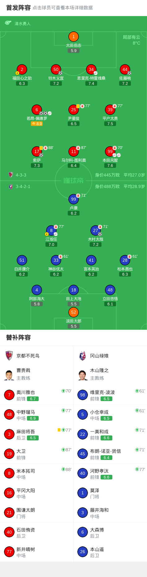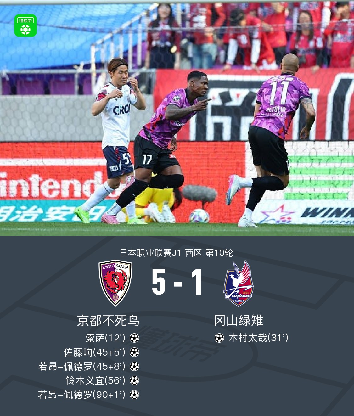 北京时间4月11日日本职业联赛J1 西区 第10轮,京都不死鸟主场对阵冈山绿雉。京都不死鸟索萨破门,佐藤响破门,若昂-佩德罗梅开二度,铃木义宜破门。冈山绿雉木村太哉破门。最终比分京都不死鸟 5–1 冈山绿雉。