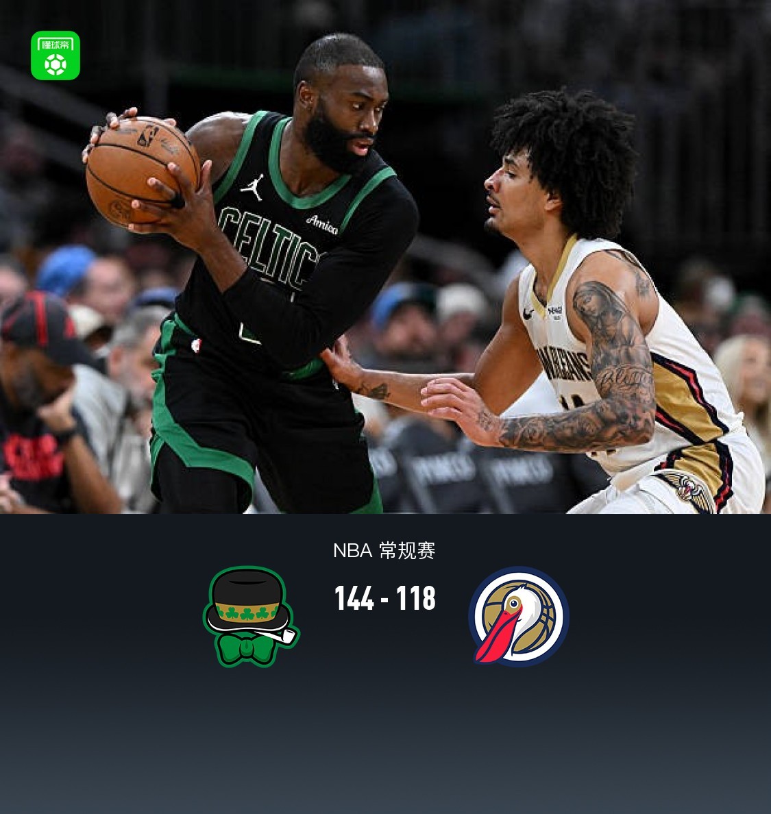 第四节凯尔特人加尔扎拿下9分,鹈鹕费尔斯拿下14分,最终凯尔特人144-118战胜鹈鹕