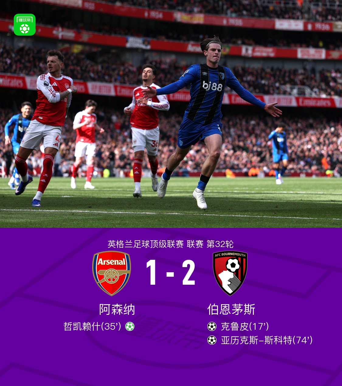 北京时间4月11日英格兰足球顶级联赛第32轮,阿森纳主场对阵伯恩茅斯。哲凯赖什点射破门。克鲁皮、亚历克斯-斯科特分别建功。最终比分阿森纳1–2伯恩茅斯。