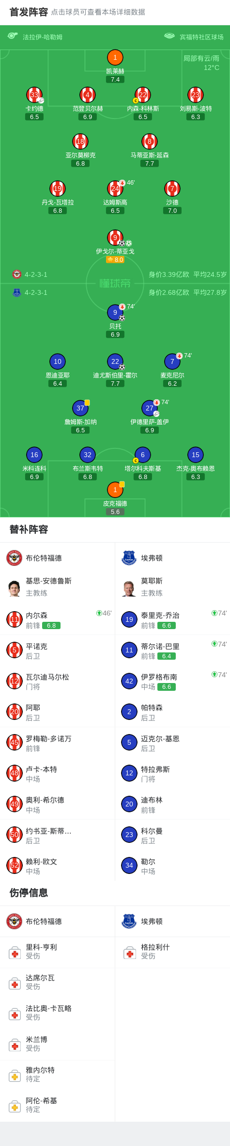 北京时间4月11日22:00,英超第32轮,布伦特福德主场对阵埃弗顿。上半场,皮克福德铲倒沙德被判罚点球,伊戈尔-蒂亚戈点射命中,布兰斯韦特远射打偏,贝托头球扳平比分。下半场,内森-科林斯头球攻门击中门框,卡约德射门打在伊戈尔-蒂亚戈身上弹进球门,霍尔补时抽射绝平,最终,布伦特福德2-2埃弗顿遭联赛4连平。