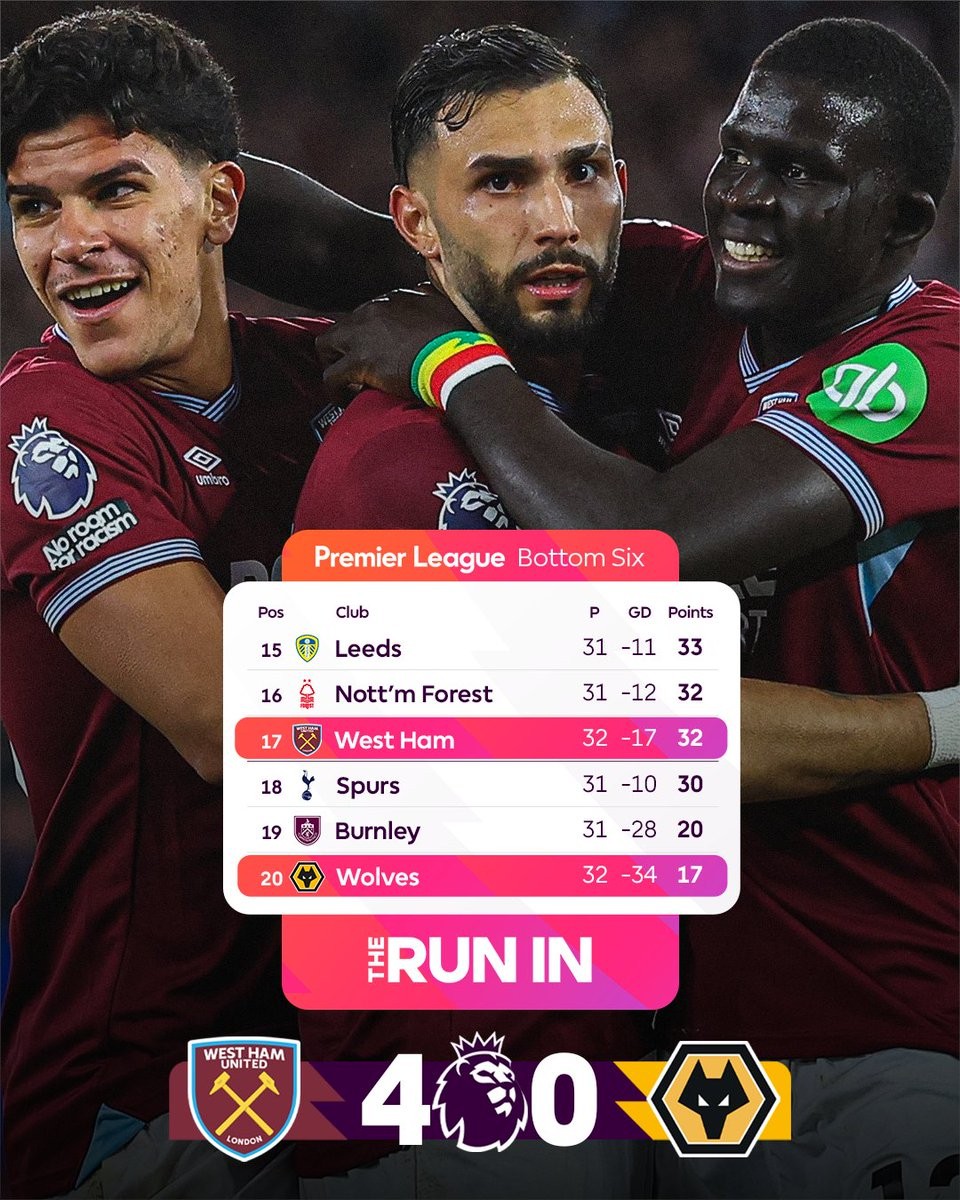 英超第32轮率先开打的一场比赛中,西汉姆联主场4-0大胜狼队,暂时跳出降级区,这也使得热刺自2009年以来首次在进行了至少三场比赛后跌入降级区。
