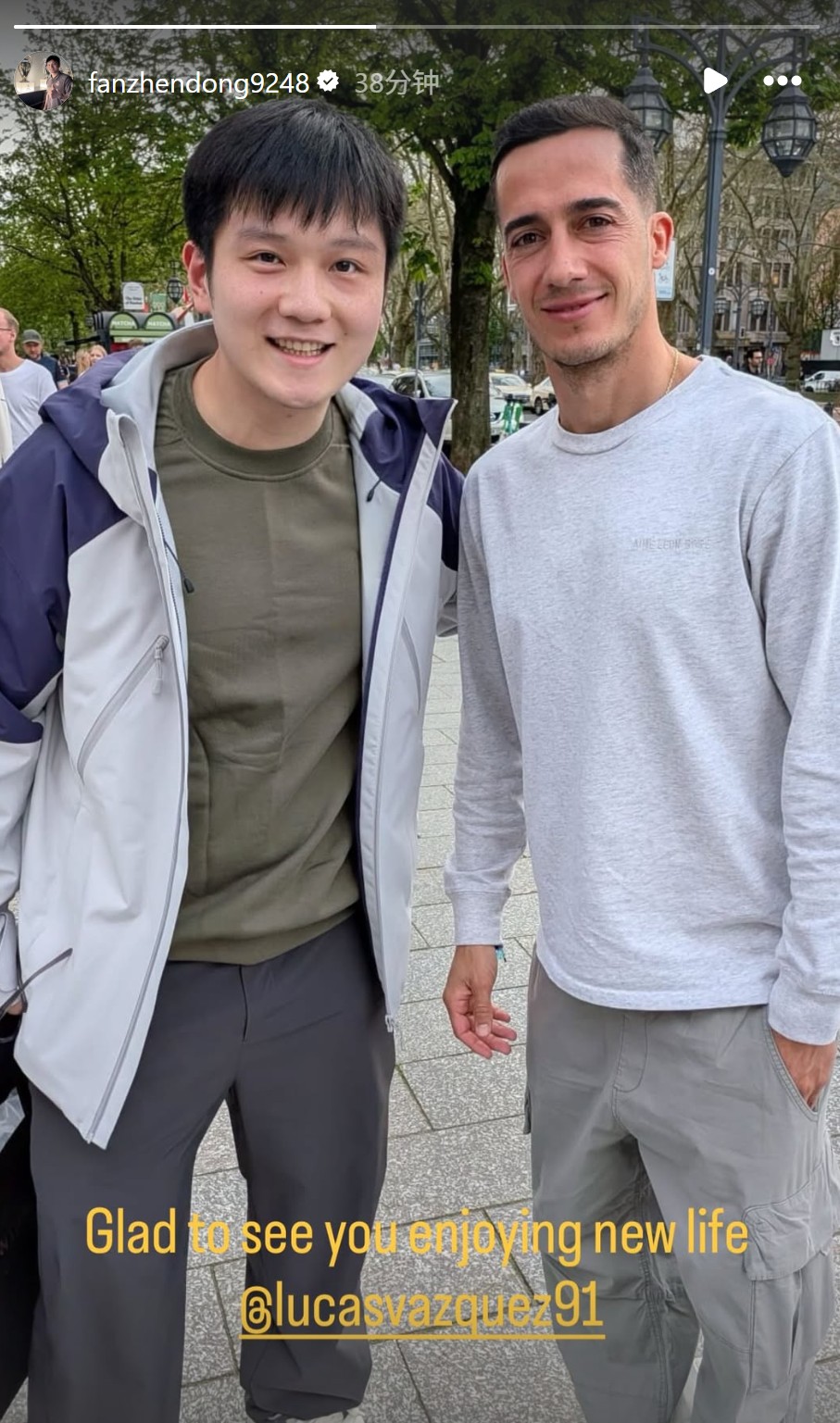 两人此次在德国街头偶遇,樊振东作为知名的皇马球迷,也是通过社媒表达了与前皇马球员巴斯克斯相逢的喜悦之情。