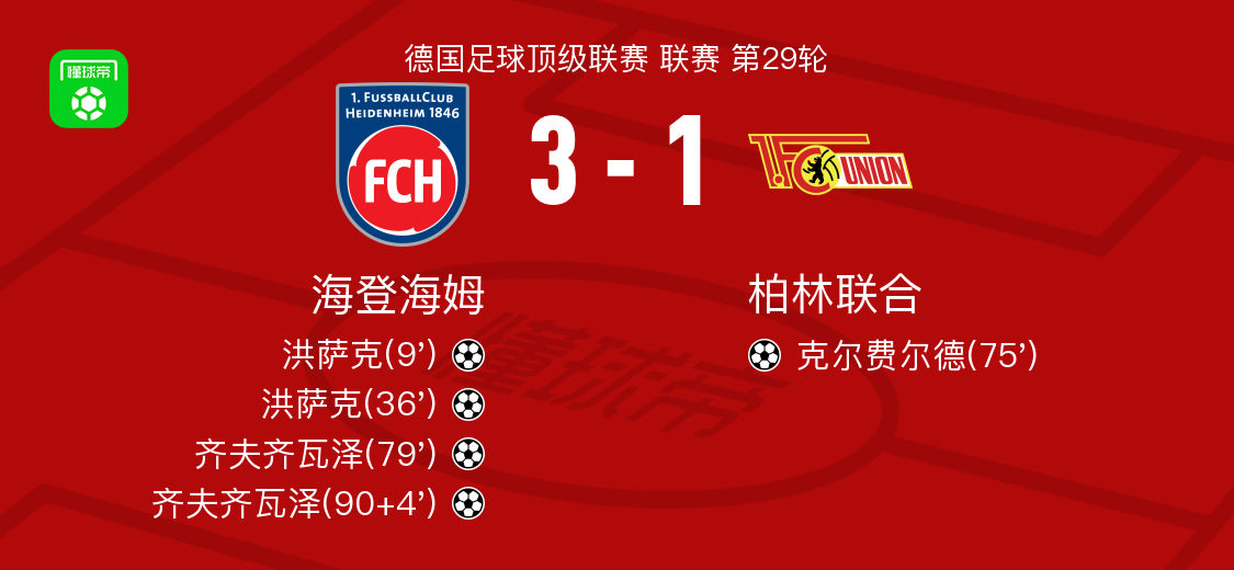 北京时间4月11日德国足球顶级联赛 联赛 第29轮,海登海姆主场对阵柏林联合。海登海姆洪萨克梅开二度,齐夫齐瓦泽梅开二度。柏林联合克尔费尔德破门。最终比分海登海姆 3–1 柏林联合。