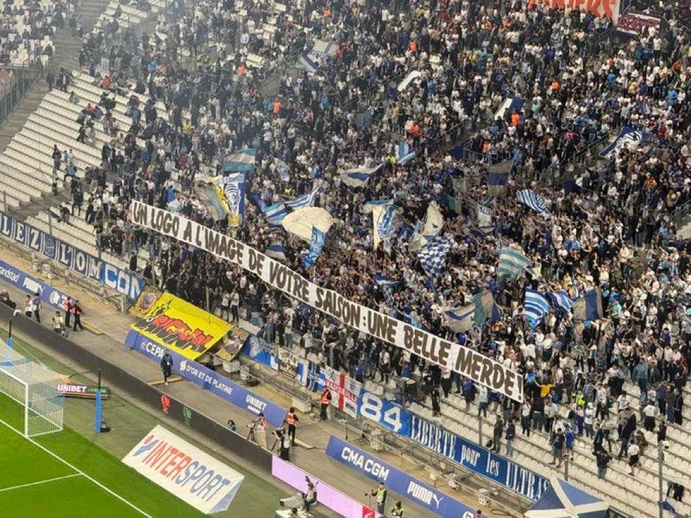 马赛球迷在横幅上写道:新队标跟这个赛季一样是一坨屎!另一条横幅上则写着:垃圾队标,不稳定的球队,你们把一切都搞砸了!