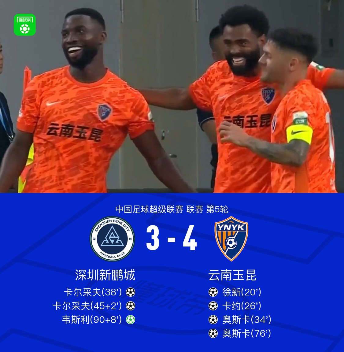 北京时间4月12日中国足球超级联赛 联赛 第5轮,深圳新鹏城主场对阵云南玉昆。深圳新鹏城卡尔采夫梅开二度,韦斯利破门。云南玉昆徐新破门,卡约破门,奥斯卡梅开二度。最终比分深圳新鹏城 3–4 云南玉昆。