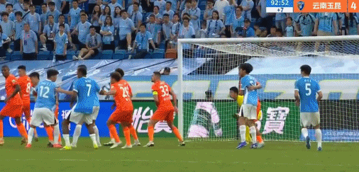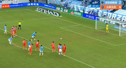 第90+8分钟,张宸梁手球送点,韦斯利操刀命中,新鹏城3-4!