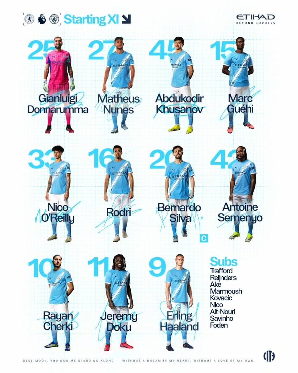 曼城首发:25-多纳鲁马、27-努内斯、45-胡桑诺夫、15-格伊、33-奥赖利、16-罗德里、20-B席、42-塞门约、10-谢尔基、11-多库、9-哈兰德