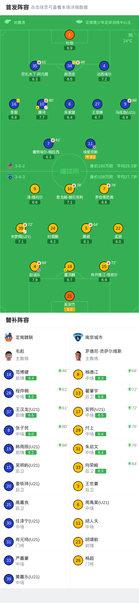 北京时间4月12日中国足球甲级联赛 联赛 第4轮,定南赣联主场对阵南京城市。定南赣联埃里克斯破门。南京城市赵诚乐破门。最终比分定南赣联 1–1 南京城市。