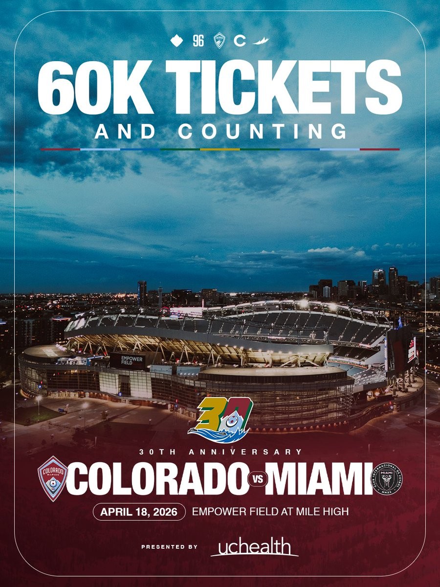 北京时间4月19日凌晨4点30分,美职联第8轮一场焦点战即将打响,科罗拉多急流将在主场迎战迈阿密国际。赛前,急流俱乐部官方确认,本场比赛门票销量已突破6万张,刷新队史票房纪录。