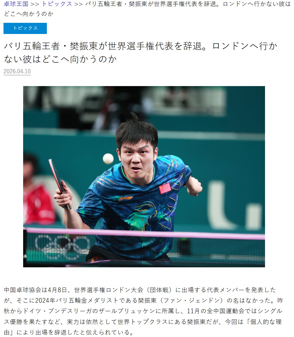 近日,日本权威乒乓球媒体《卓球王国》发布文章,题目为《巴黎奥运冠军樊振东退出世锦赛代表阵容。不去伦敦的他将去向何方?》
